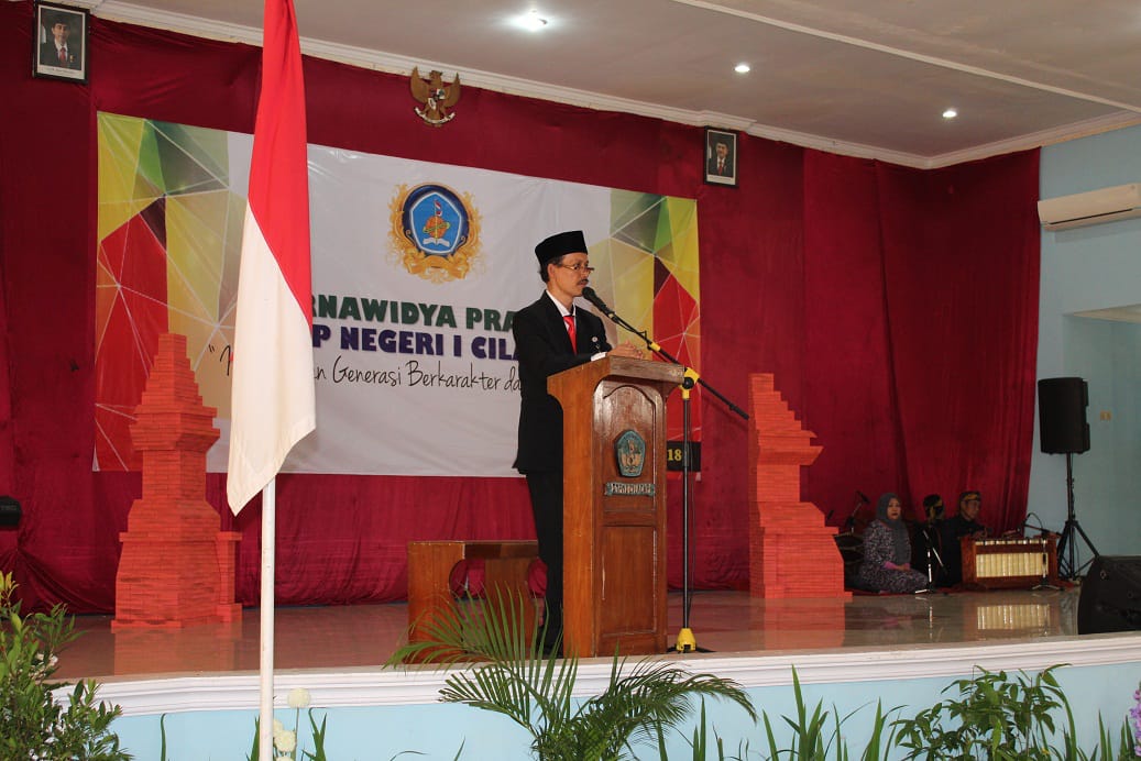Kastam, S.Pd.MM. dalam sambutannya menerangkan bahwa seluruh siswa dan siswi SMPN 1 Cilacap tahun pelajaran 2017/2018 dengan jumlah seluruh siswa 314 dinyatakan lulus 100%. Dan alhamdulillah pada tahun ini jumlah rat-rata hasil UNBK mengalami peningkatan yang signifikan dibanding tahun sebelumnya yaitu 311,4. Dengan hasil ini SMPN 1 Cilacap menjadi Peringkat 1 sekabupaten Cilacap.
