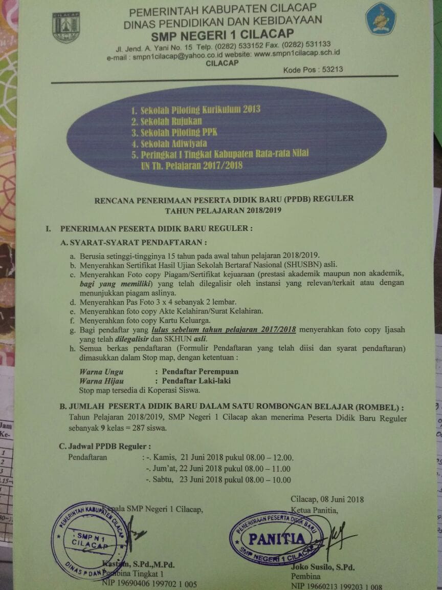 PPDB REGULER SMPN 1 CILACAP tahun 2018