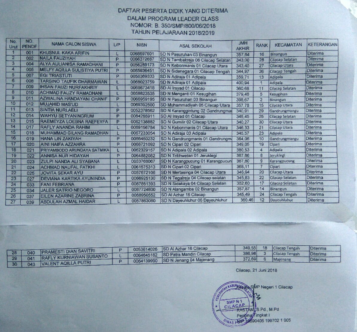 Berikut ini hasil PPDB Leader Class SMP Negeri 1 Cilacap tahun 2018.