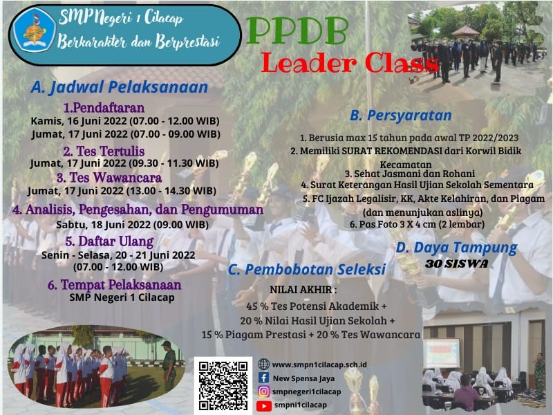 PPDB Leaderclass Tahun 2022/2023 dipublikasikan oleh IT Spensa | 30 Mei 2022 0 Komentar Mari bergabung dengan Kelas unggulan di Cilacap Leaderclass SMP Negeri 1 Cilacap